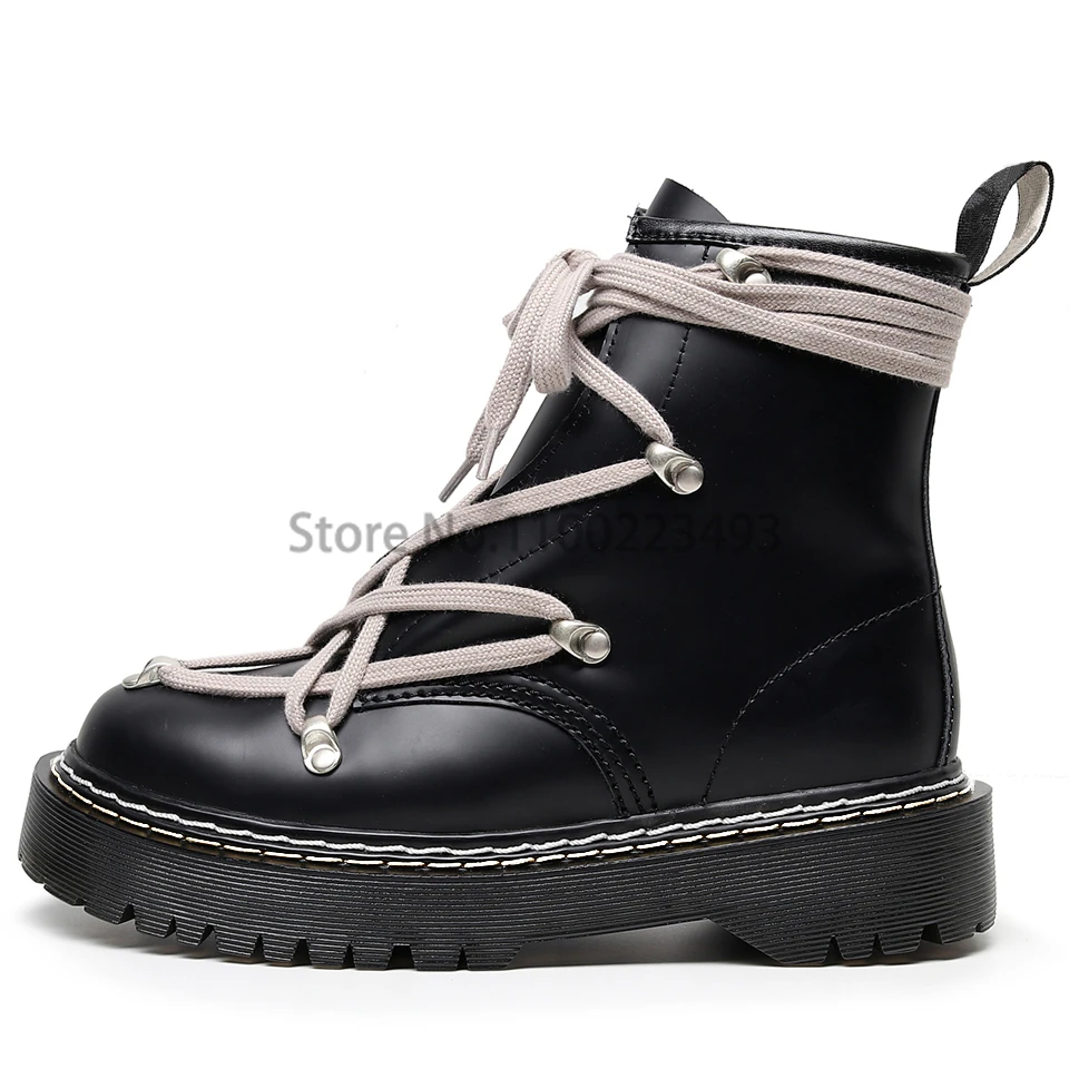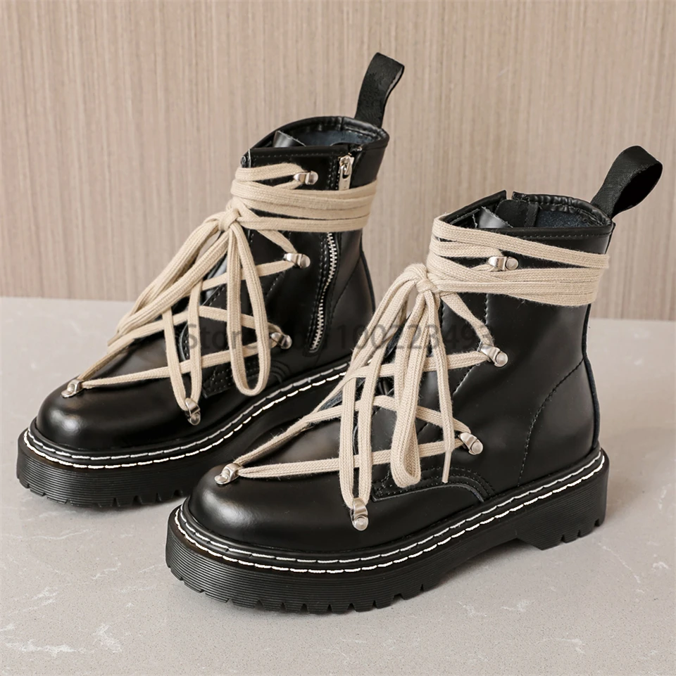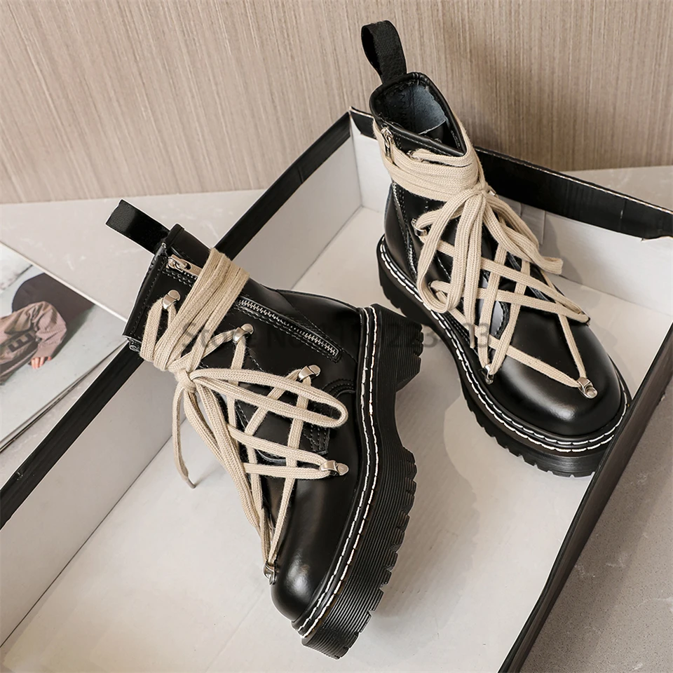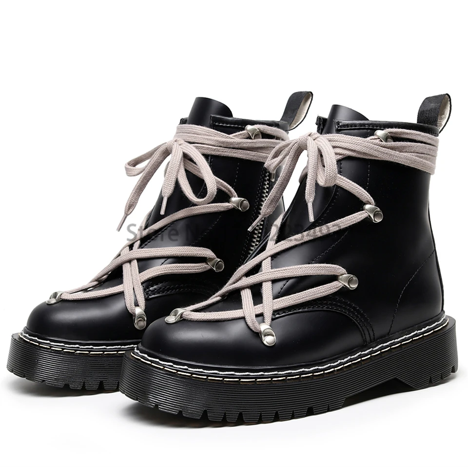 Motorcycle Winter Women's Leather Boots Cross-tied Wedges Female Lace Up Platforms Boots Men Black Punk Shoes Botas Mujer