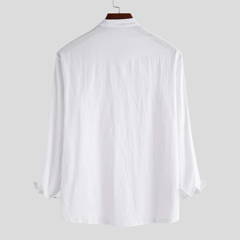 Blouses Solid Pullover Men T Shirts Long Sleeve Casual Shirts Spliced Stand Collar Shirt Button Loose